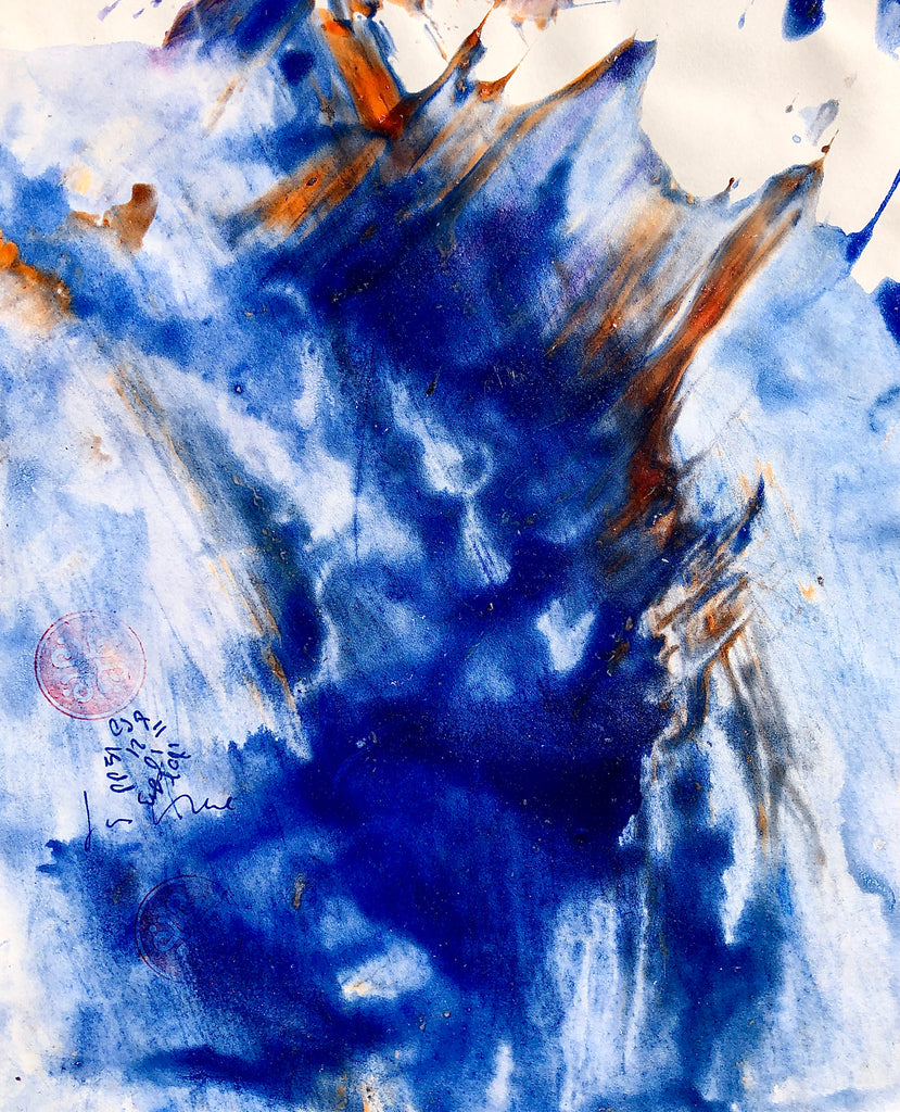 Signature: FACE Bottom left James Arax in blue ink, circular writing with title and date of production in blue ink - Presence Painting XS standard marking in red ink