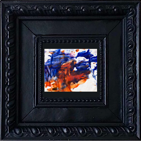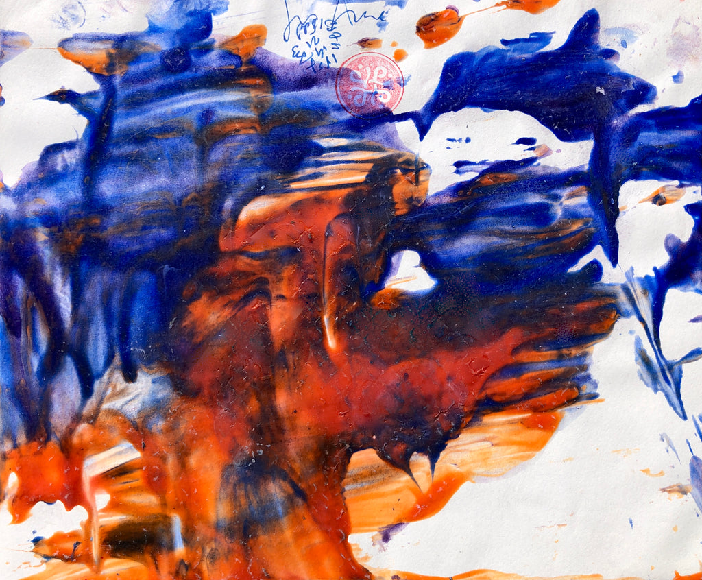 PP51 XS19 - This XS painting on paper reflects the mix technique of James with both solid and liquid elements. A very contrasted palette of oranges and blues playing with the white surface of the paper.