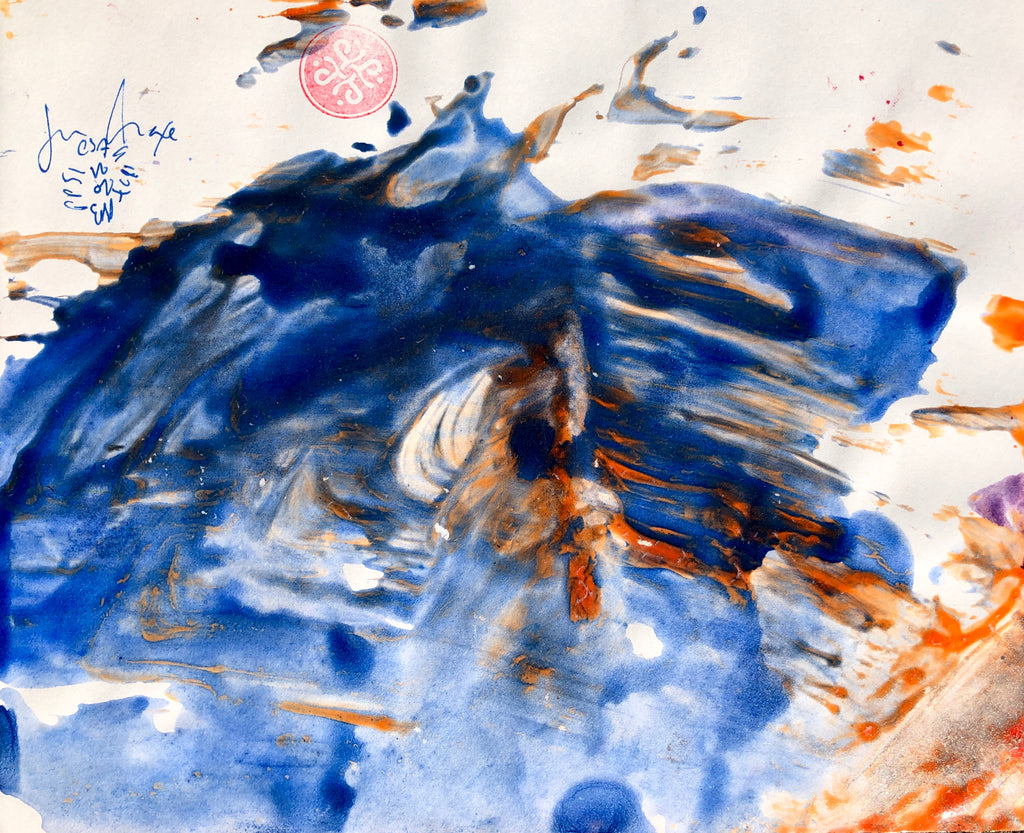 Signature: FACE Top left James Arax in blue ink, circular writing with title and date of production in blue ink - Presence Painting XS standard marking in red ink