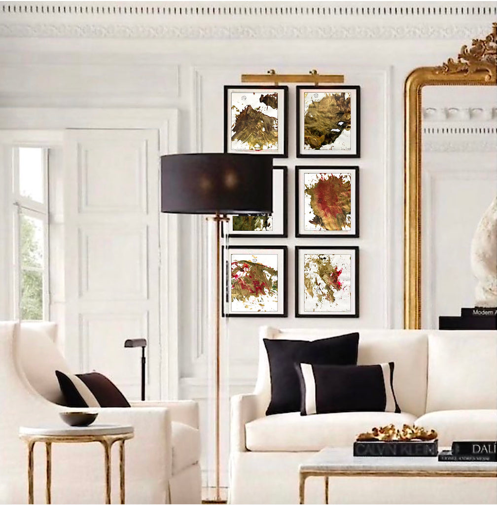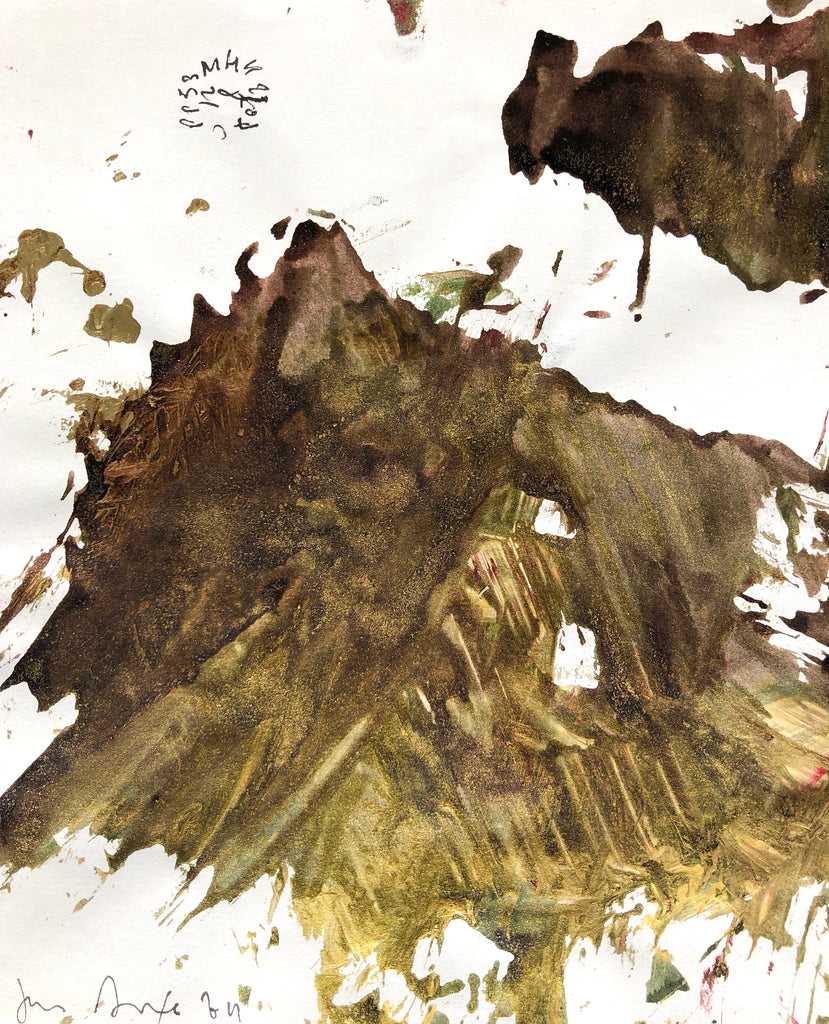 Mixed technique: Acrylic, ink, gold pigment, glue on paper