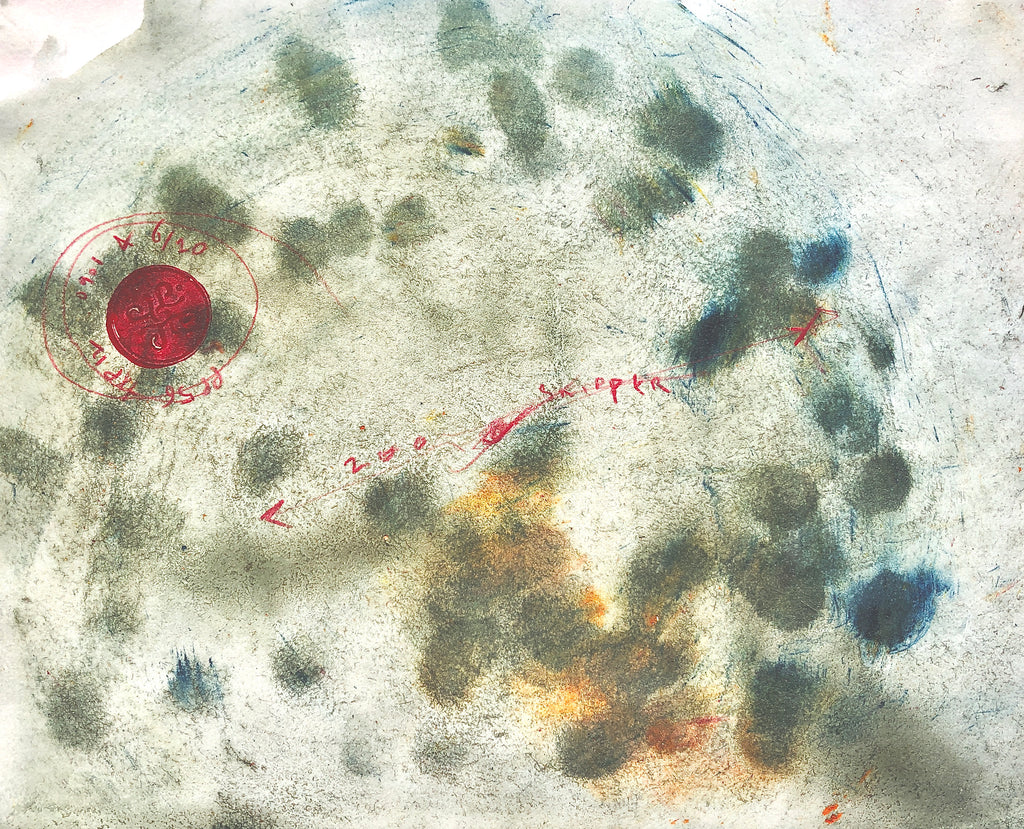Many traces on paper like sniper bullet holes. Paper full of energy, concentration of traces, colored background like the mental landscape of the sniper. Here « the target is located 200m away », gey-green, clear background, a little blue....